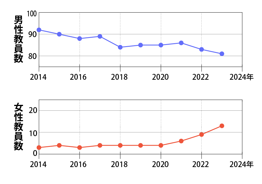 ここ10年ほどの男性教員と女性教員の人数の移り変わりを示しています。女性教員の数が増えてきています。