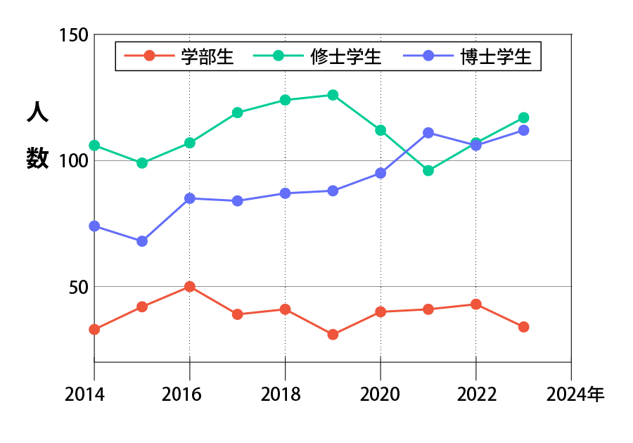 ここ10年ほどの学生数(学部・修士・博士)の移り変わりを示しています。博士学生の数が増えてきています。