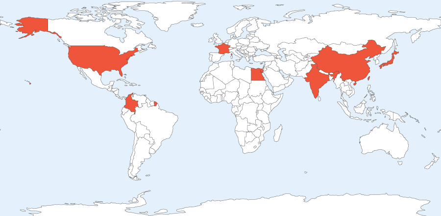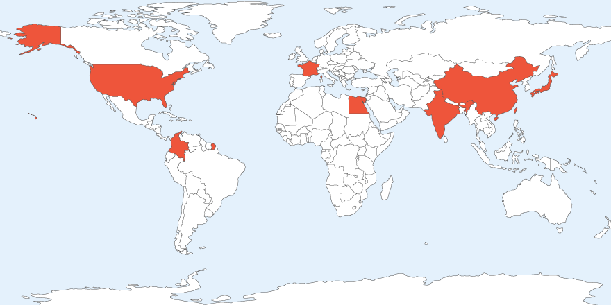 これまでに在籍した教員の出身地を赤色で示しています。世界各地から国際的な研究者が集まっています。